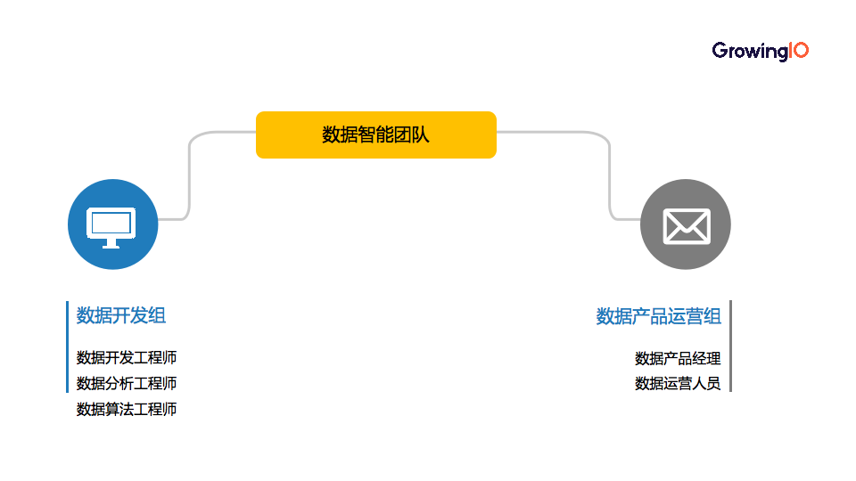 数据智能团队由以下两个部分组成。左边是传统的数据团队,右边是数据产品经理和数据运营人员两类新兴岗位,两者共同构成数据智能团队。