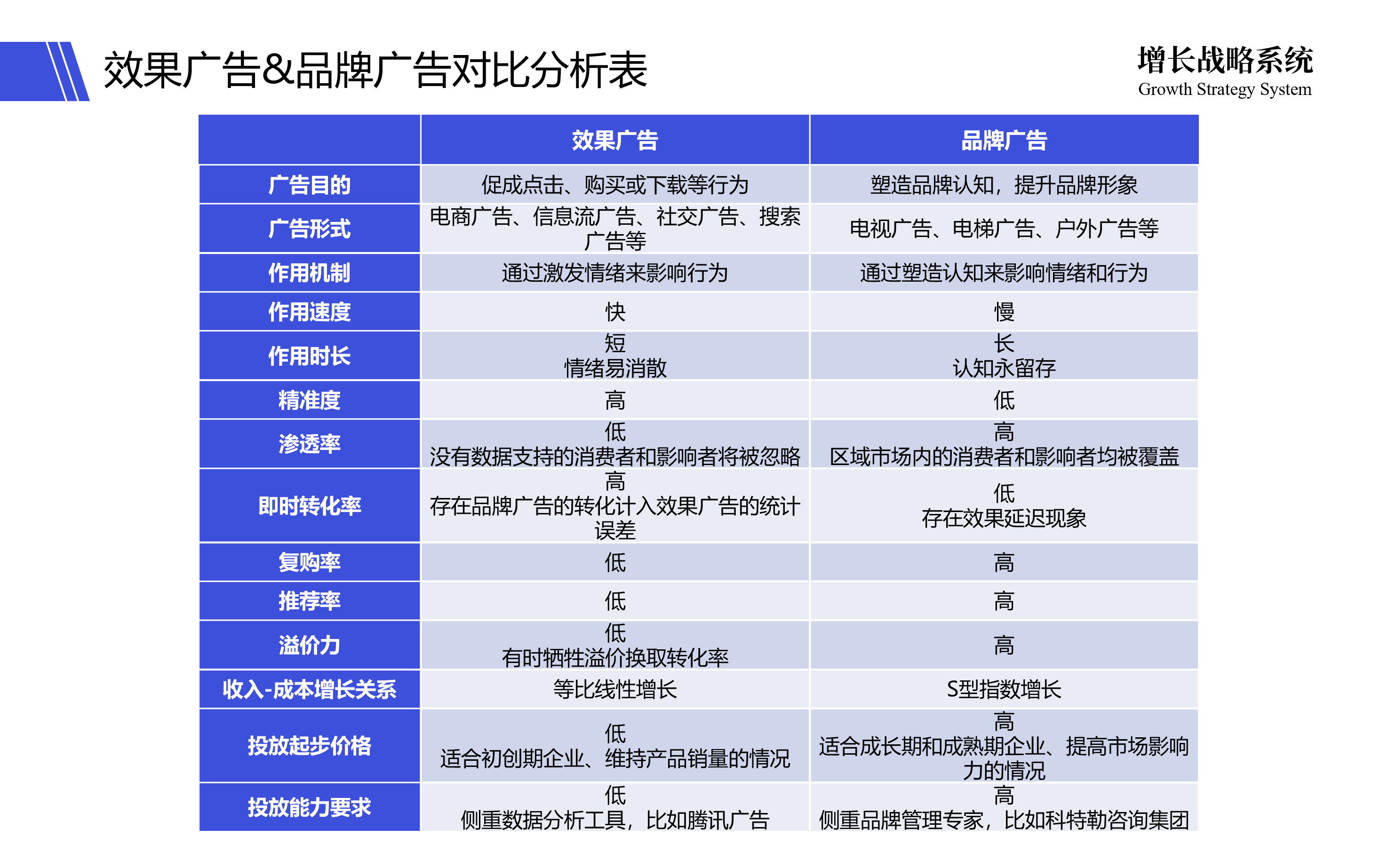 最后,分享一张关于效果广告和品牌广告的对比分析表,祝你有所启发。