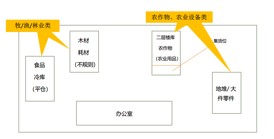 以村社为单位建立集中物理仓库,不同品类进行不同库区及库位存放;