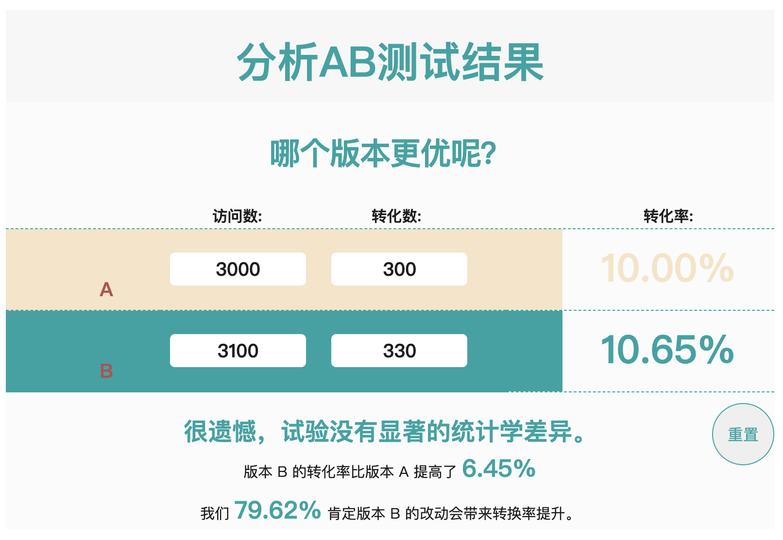 以上图为例,虽然B组的转化率比A组高,但是因为样本量较小,试验结果没有达到显著的统计学差异,所以我们不能得出B组优化比A组更好的结论。
