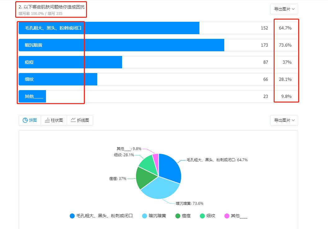 为了进一步提高推品的精准度,在问卷设计中,我们又引导用户去勾选最迫切需要解决的皮肤问题,如下所示: