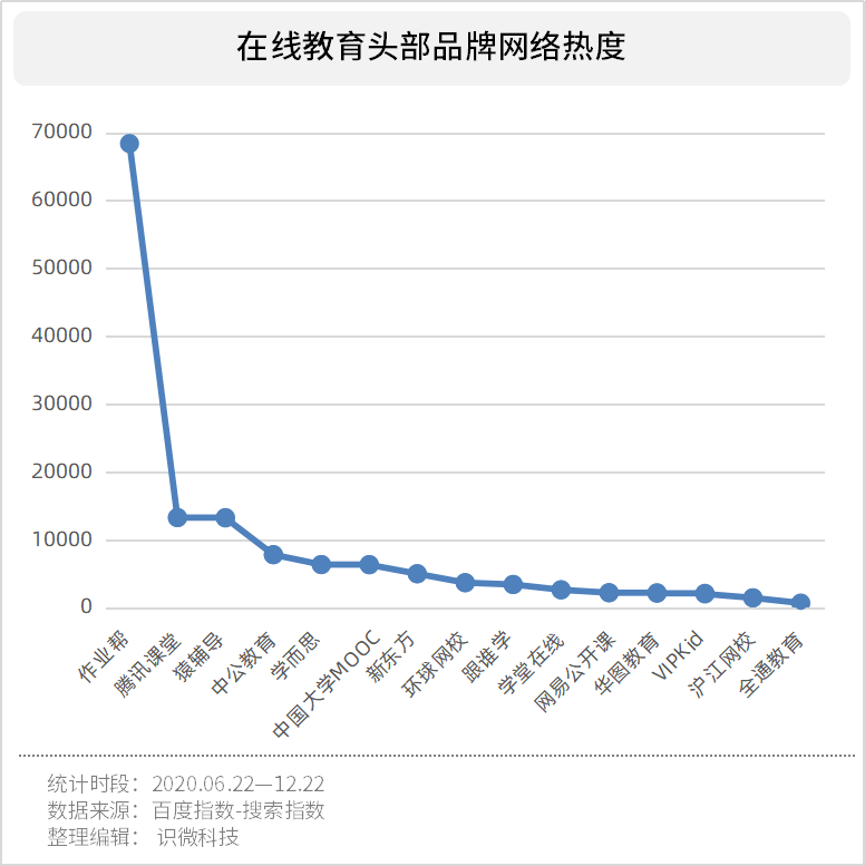 在经过对选取的15个在线教育头部品牌的网络热度做出统计后,可以看出在2020下半年,作业帮凭借明星代言、综艺植入、硬广铺陈等多种方式打出的营销组合拳获得了良好成效,网络热度一骑绝尘,远超其他品牌成为热度第一;腾讯课堂及猿辅导分居二、三位,其余品牌以相互间并不过于悬殊的差距位列其后。