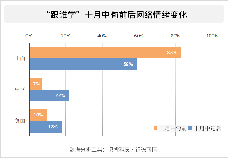 不单在资本市场对跟谁学的信心在下降,网络上关于跟谁学的舆情表达情绪也在随之下降;相较于第三季度财报公布前,网络正面情绪下降了24%,负面情绪上升了8%。跟谁学在长期盈利与资本投入这些要素上积累的优势,开始因多位在线教育玩家同样“跑马圈地式”营销战略的展开,而逐渐失去主动权。