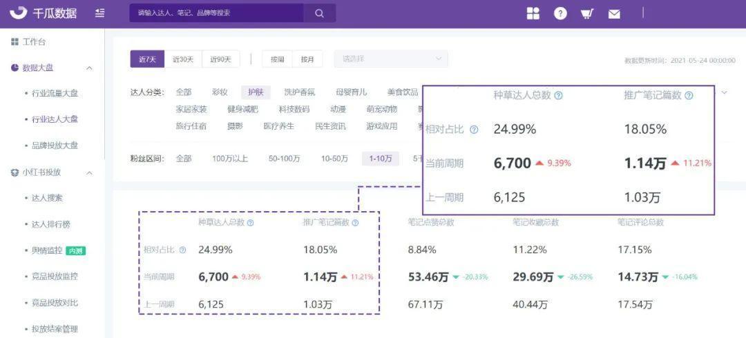 千瓜小红书行业达人大盘,为用户提供市场宏观监测,了解小红书近期时间范围内各行业达人种草数据和趋势,更好的助力品牌发展。