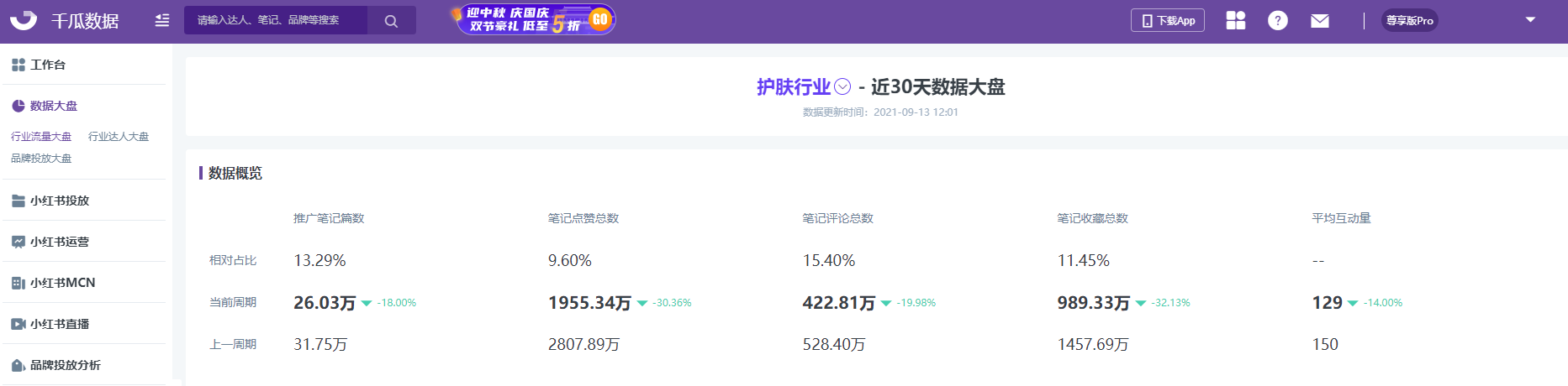 通过千瓜(小红书数据分析平台),我们来看看小红书近30天的行业大盘。