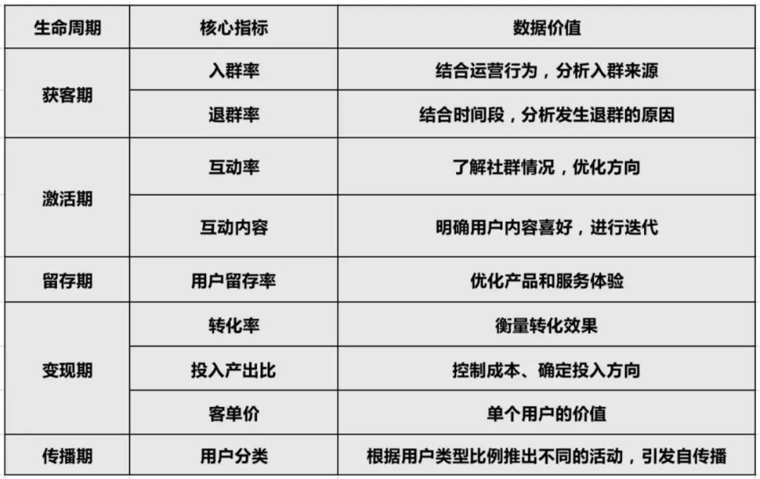 这个阶段主要是测算用户的忠诚度与满意度,区分不同类型用户的比例,从而设计不同的活动,重点注意“用户的分类”。