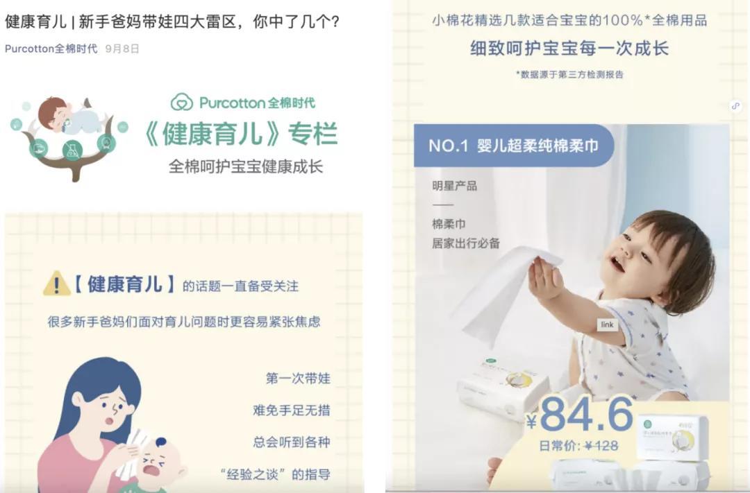 例如全棉时代的用户很多是宝妈,在育儿上有大的需求及痛点。在全棉时代的公众号中发布「带娃雷区」的内容,转发至社群中吸引用户观看,最后为产品做引流。