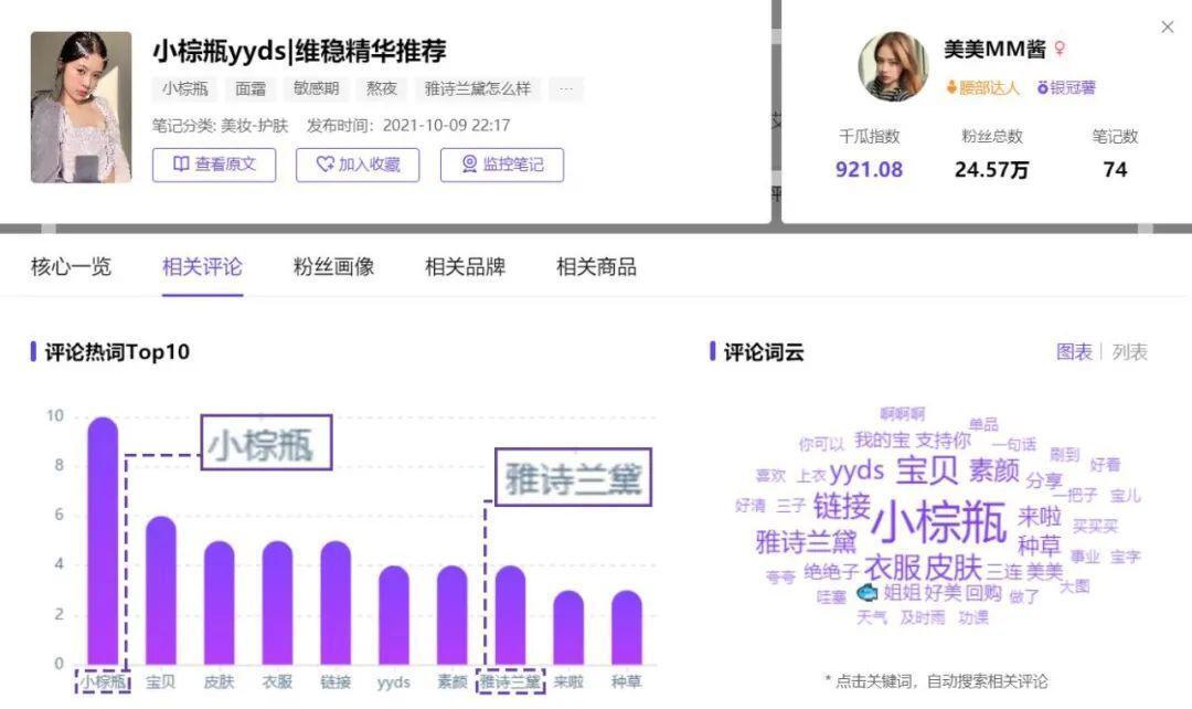 与雅诗兰黛合作笔记相关评论中,产品词“小棕瓶”位居评论热词首位,品牌词“雅诗兰黛”、意向词“种草”等均呈现出达人对粉丝的成功种草。